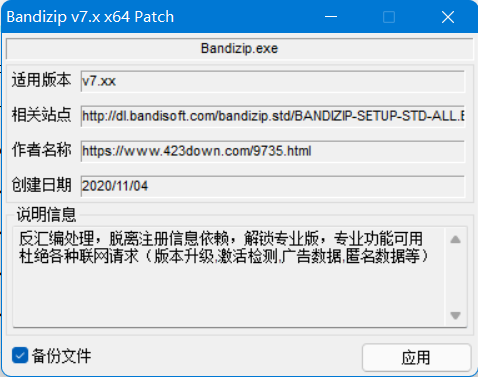 补丁下载:Bandizip.v7.xx.x64.Patch.20201104.zip