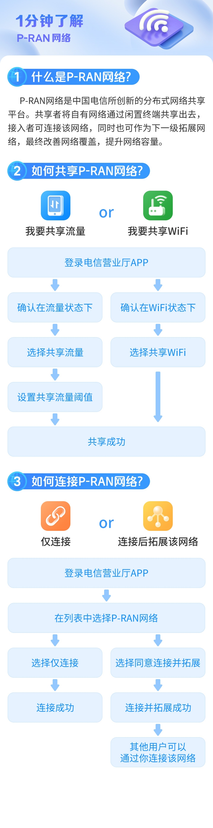 P-RAN网络是中国电信所创新的分布式网络共享平台。共享者将自有网络通过闲置终端共享出去,接入者可连接该网络,同时也可作为下一级拓展网络,最终改善网络覆盖,提升网络容量。