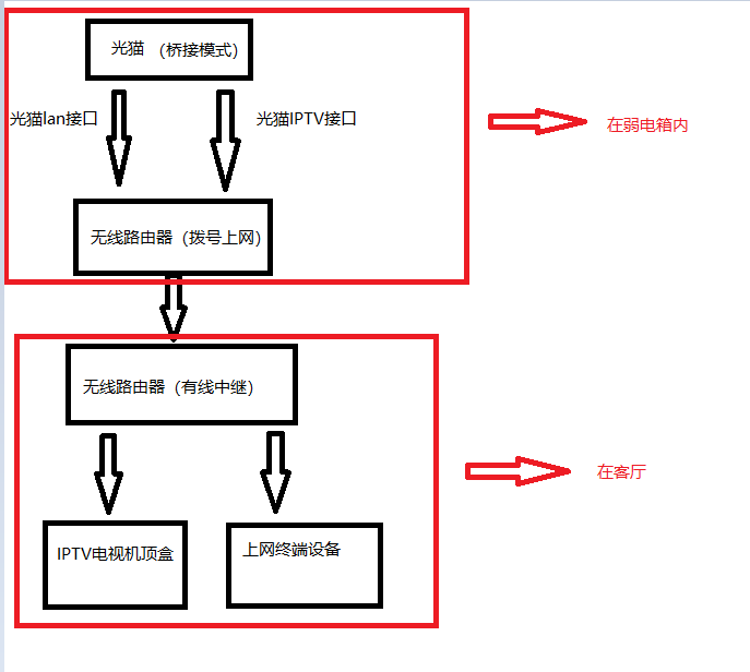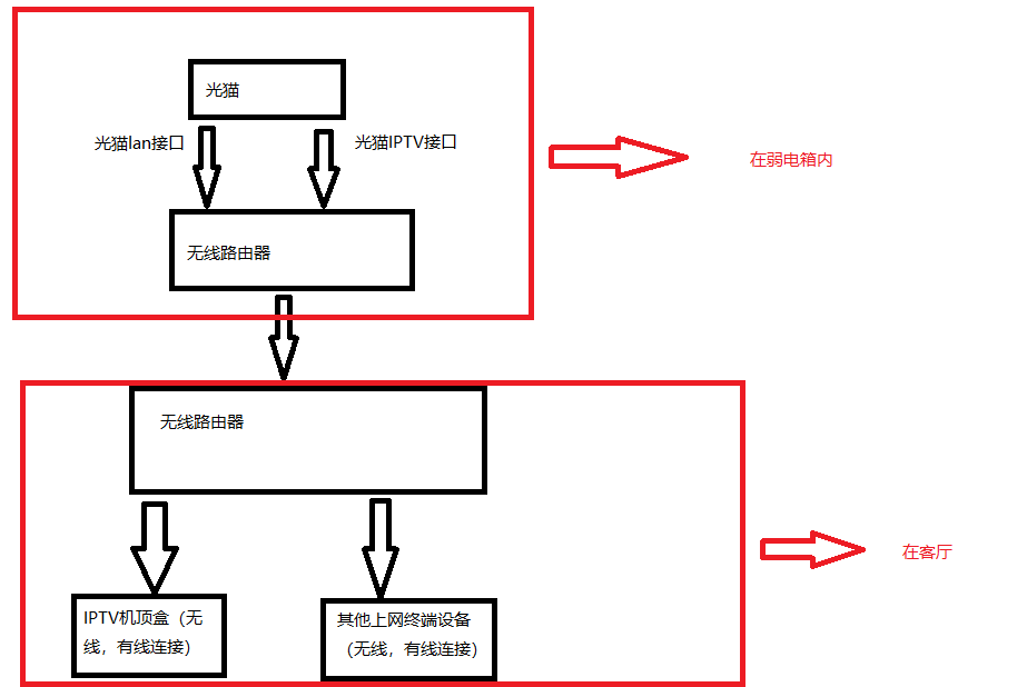 家里安装了宽带,光猫放在弱电箱,然而客厅只预留了一根网线给无线路由器,客厅还需要接入IPTV电视